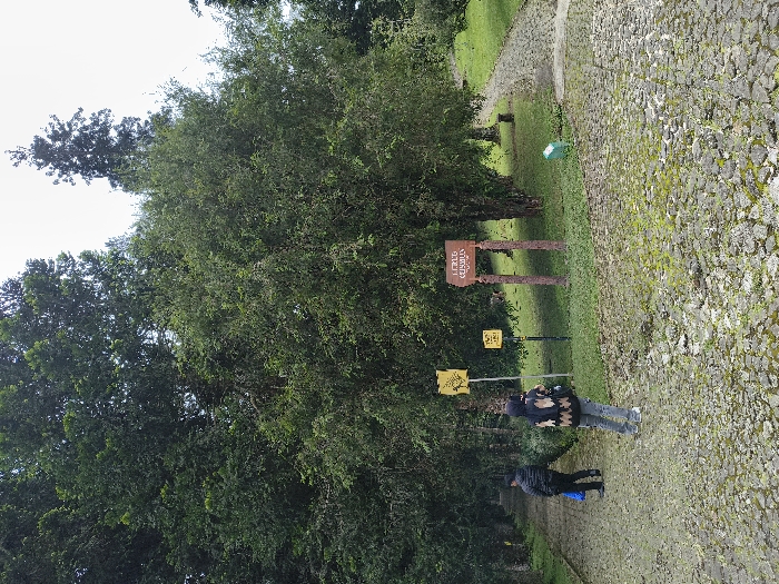 A stone path weaves through a green area, flanked by lush trees. Two people walk along the path near trail markers. A wooden sign marked "Little Gardens" stands amidst the greenery. The stone path is partially covered in moss, suggesting a damp environment. The scene evokes a sense of natural beauty and a calm, outdoor setting.