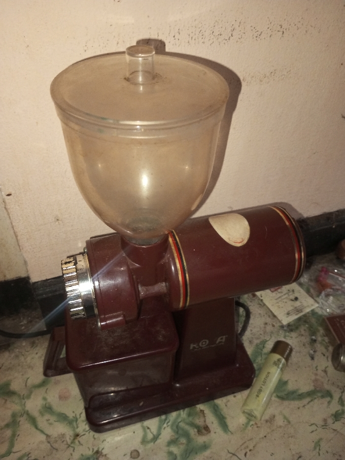 A vintage "KO A" coffee grinder sits on a tiled surface against a pink wall. It features a clear plastic hopper atop a maroon-colored grinding mechanism. A silver knob adjusts grind size. The grinder has a boxy base and a cylindrical motor housing. Beside the machine, a tube of "Body Lotion" lies on the tile, adding to the cluttered, aged aesthetic.