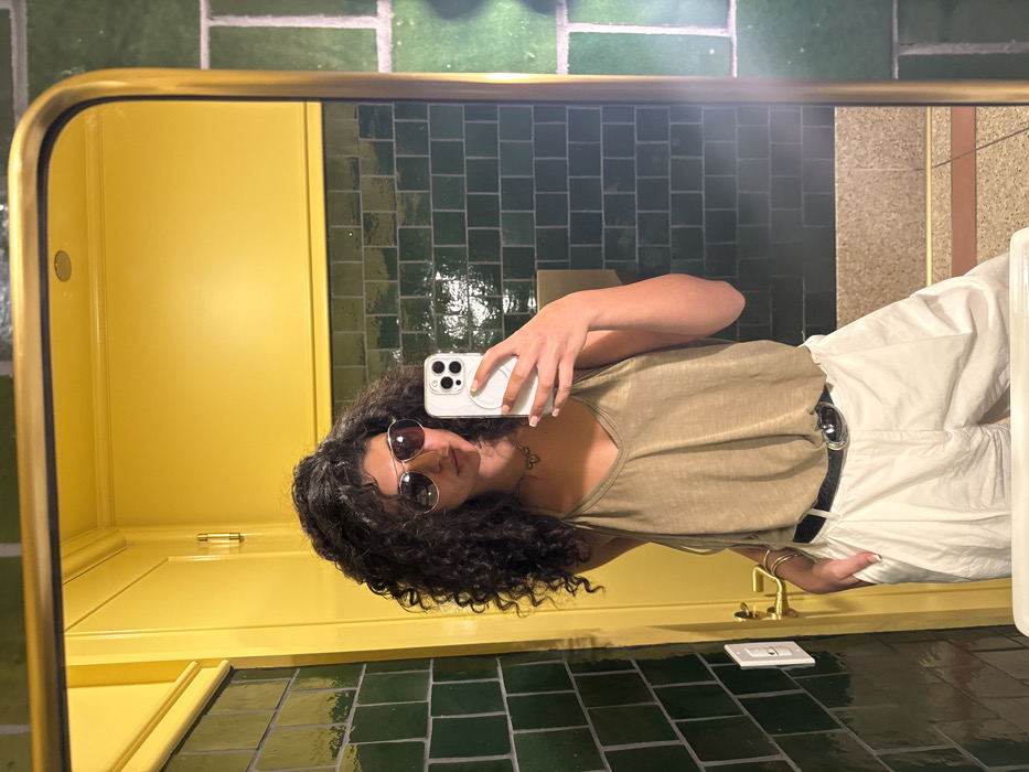 A female subject is captured in a mirror selfie within what appears to be a public restroom or dressing area in West Hollywood, United States of America. The subject has dark, curly hair and is wearing aviator-style sunglasses, a light olive-green V-neck tank top, light-colored pleated pants, and a black belt with a prominent silver buckle. A delicate necklace and a gold-toned bangle are also visible. The subject holds a white smartphone with a multi-lens camera array in their right hand, extended to take the photograph. The background consists of dark green square tiles covering the lower and mid-section of the walls. Above the tiles, the wall and a door frame are painted bright yellow. A white light switch and a gold door handle are visible on the yellow surface to the left of the subject. A light-colored, possibly beige, textured countertop or sink area is visible below the green tiles. The mirror is framed in gold-toned metal.