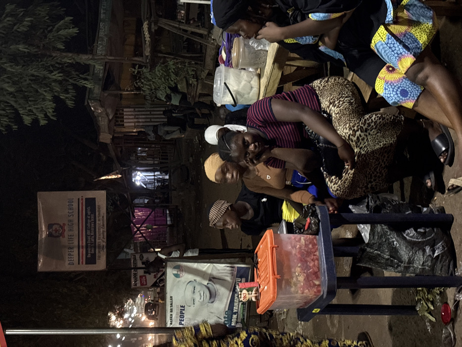 An outdoor night scene shows several people gathered around a makeshift table. At least three are seated, while others stand or lean in. One sign reads "DEEPER LIFE HIGH SCHOOL", and another political poster shows a man with text "BARKA DA SALLAN" and "PEOPLE". An orange container filled with red contents sits on a blue table. A black trash bag rests on the ground nearby, adding to the cluttered ambiance of the location. The atmosphere is dimly lit, with the source of light mostly from street lamps.