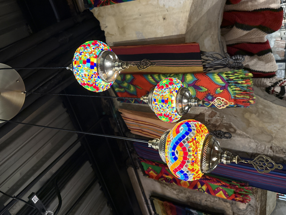 - "Three illuminated mosaic glass lamps hang from a circular brass-toned ceiling plate by black cords in an indoor setting within Panama City, Panama" by FM-rjc8l1, licensed under CC BY 4.0