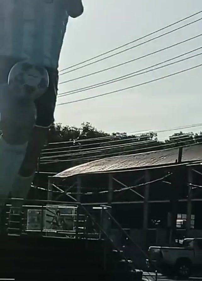 statue of Diego Maradona in an Argentina soccer jersey, juggling a soccer ball with his left knee. It is outdoors with overhead power lines and a utility pole in the background. There's also a covered structure with a pickup truck parked beside it in the background. The weather appears to be sunny.