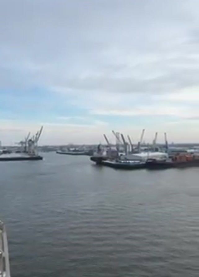 harbor from an elevated position. In the foreground is a dark body of water. The background shows a harbor with ships, cranes, and tanks. The sky is cloudy with the sun appearing towards the right.