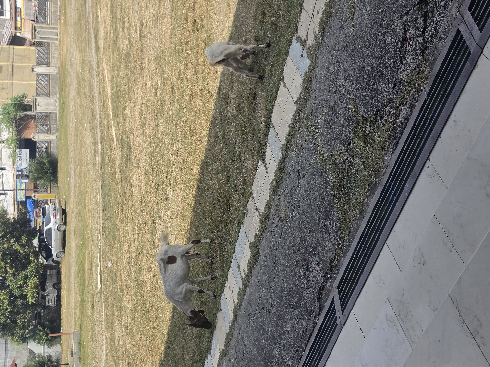 An outdoor daytime scene in Grong-Grong, Indonesia, captures two domestic goats grazing on a dry grassy field. The perspective originates from an elevated position, overlooking light-colored tiled steps leading to a dark metal drainage grate, beyond which lies a cracked asphalt path bordered by a walkway of alternating light gray and blue-gray tiles. The first goat, positioned on the left, is white with distinctive brown markings on its head, right flank, and lower legs. It stands facing left, with its head lowered, actively consuming sparse ground vegetation. The second goat, situated further right and partially within a shadow line, is light-colored and faces away from the camera, with its head bent low towards the ground, also appearing to graze. The central and background areas consist of a large field covered in predominantly dry, yellowish-green grass with visible bare earth patches. To the far left background, a large tree provides shade for several parked vehicles, including a white SUV, a dark SUV, and a silver Toyota Corolla sedan. Beyond the field, a concrete fence with decorative elements separates the area from various buildings, one displaying a sign reading "UD. JODOH KAMI." Strong shadows across the scene indicate direct sunlight.