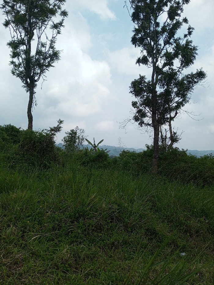The scene depicts an unpopulated natural landscape in Ciherang, Indonesia. The foreground is dominated by dense, unmaintained green grass and various low-lying plants. In the midground, two tall, slender deciduous trees with dark, visible trunks and sparse green foliage stand prominently; one is positioned on the left, the other on the right. Between these trees, a thick expanse of diverse green bushes and smaller trees covers the terrain, with the distinct broad leaves of a banana plant visible among them, slightly left of center. The background consists of distant, rolling hills or mountainous terrain, obscured by a sky filled with scattered white and gray clouds. No human subjects or artificial structures are present.