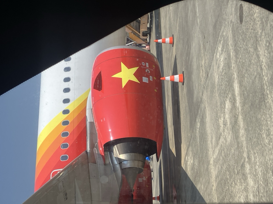 An outdoor scene on an airport tarmac in Hòa Cường Ward, Vietnam, displays the left engine, wing, and a section of the fuselage of a commercial aircraft under bright daylight
