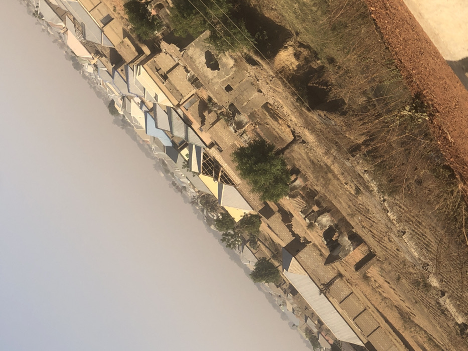 A high-angle, tilted view of a residential settlement in Hanwa, Nigeria, under a hazy, pale brown sky