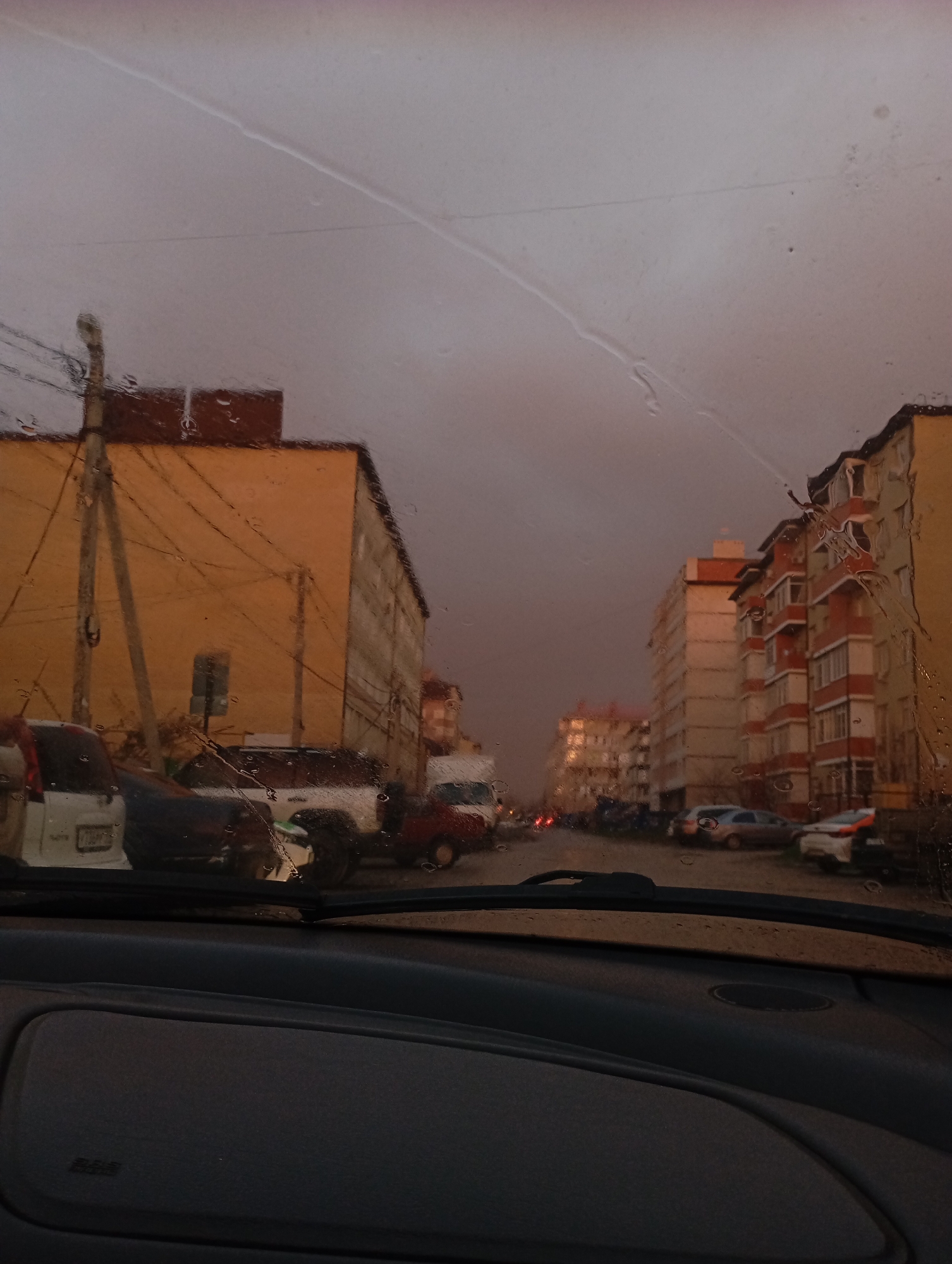 A photograph taken from inside a vehicle looking out onto a street scene, likely in Krasnodar, Russia. The foreground consists of the vehicle's dashboard, which is dark and takes up a significant portion of the lower frame. The windshield is partially obscured by raindrops. Beyond the windshield, the scene depicts a street lined with buildings. The buildings are multi-story apartment blocks, typical of urban residential areas. The architecture appears Soviet-era, with simple, functional designs. The buildings are painted in shades of yellow, orange, and white. Cars are parked along the sides of the street. The lighting suggests it is either early morning, late evening, or a cloudy day. The sky is overcast and appears a dark grey color. Power lines are visible stretching across the sky. The photograph conveys a sense of urban life on a rainy or overcast day.