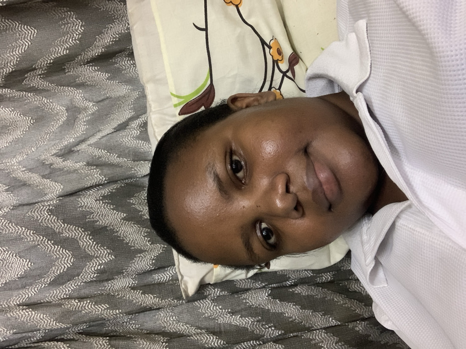An adult female subject with dark skin and dark hair pulled back from her face is depicted in a close-up, selfie-style photograph