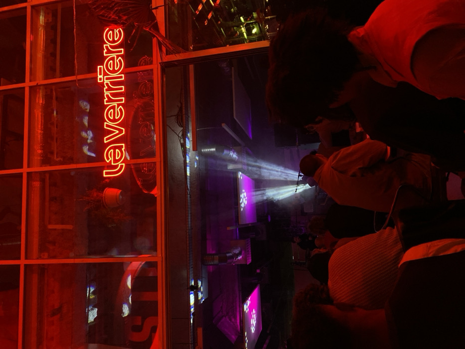 The image depicts an interior scene at "La Verrière," an event venue located in Lille, France, identifiable by the prominent red neon sign