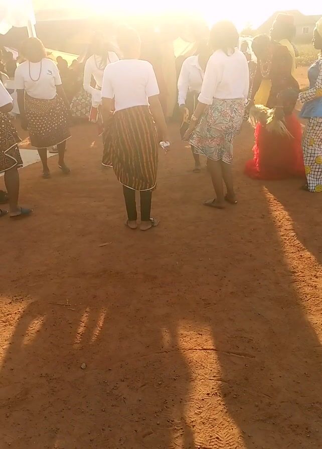 A group of people is standing and dancing in a dirt field, illuminated by a bright sun