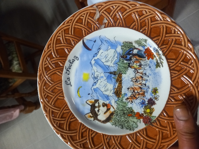 A decorative plate featuring a dog sled team scene dominates the frame. The plate's rim is woven brown. Depicted are snowy mountains, a yellow sun, a crescent moon, and a dog sled team led by a musher, set against a blue sky. A husky portrait and the inscription "La Feclaz" are visible. A human hand is on the right side of the plate. Part of a wooden chair is visible in the background.