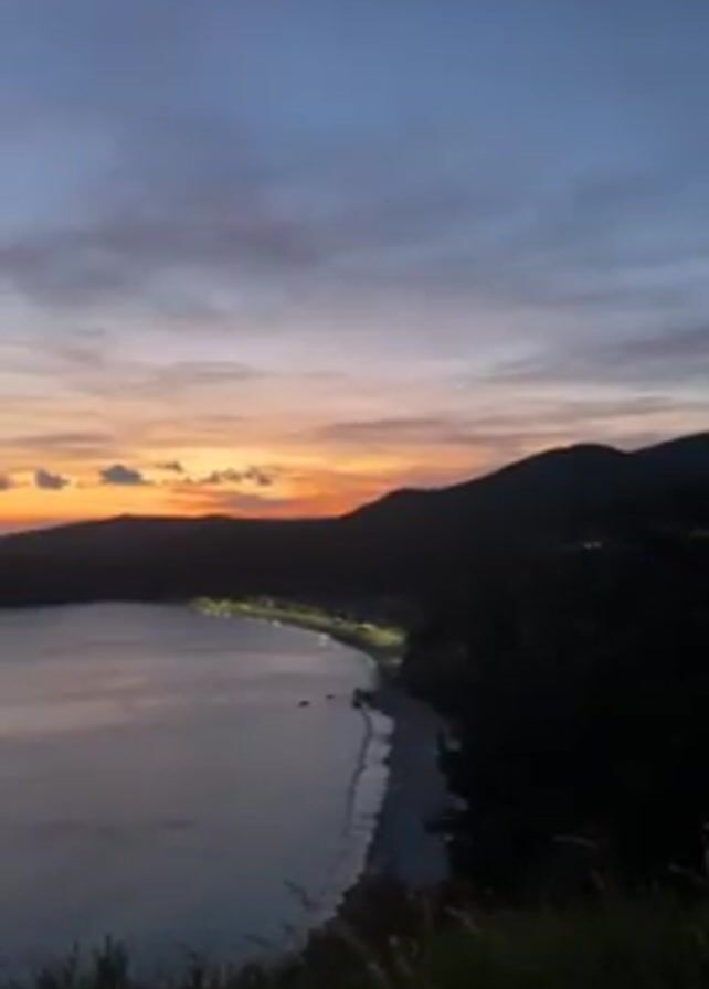 The video displays a tranquil coastal scene at dusk. A calm bay reflects the fading light, while a strip of beach illuminated by artificial lights curves along the shoreline. Dark silhouettes of hills frame the view. The sky transitions from orange to blue, punctuated by scattered clouds. Grass is visible in the foreground, suggesting an elevated vantage point. There are no visible people or interactions.