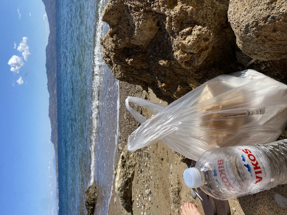The image depicts a static scene on a rocky and sandy beach, specified as Megalochori, Greece. In the foreground, a clear plastic bottle of "VIKOS Natural Mineral Water" with a white cap stands upright next to a translucent plastic shopping bag containing light-colored objects. Both items rest on the sand, adjacent to a large, textured brown rock formation on the right. A bare human left foot is partially visible in the lower-left quadrant. The immediate background consists of calm, blue-green sea water with small waves breaking softly on the shore. Across the water, a distant landmass characterized by hills or mountains is visible under a clear blue sky with a few scattered white cumulus clouds.