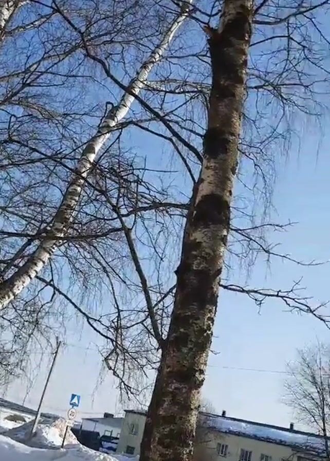 scene with several birch trees against a blue sky. The trees are mostly bare, with only a few thin branches visible. There is snow on the ground. In the background, there is a building with windows and a street sign. The camera pans upwards, focusing on the trees and sky. There are no people visible in the video.