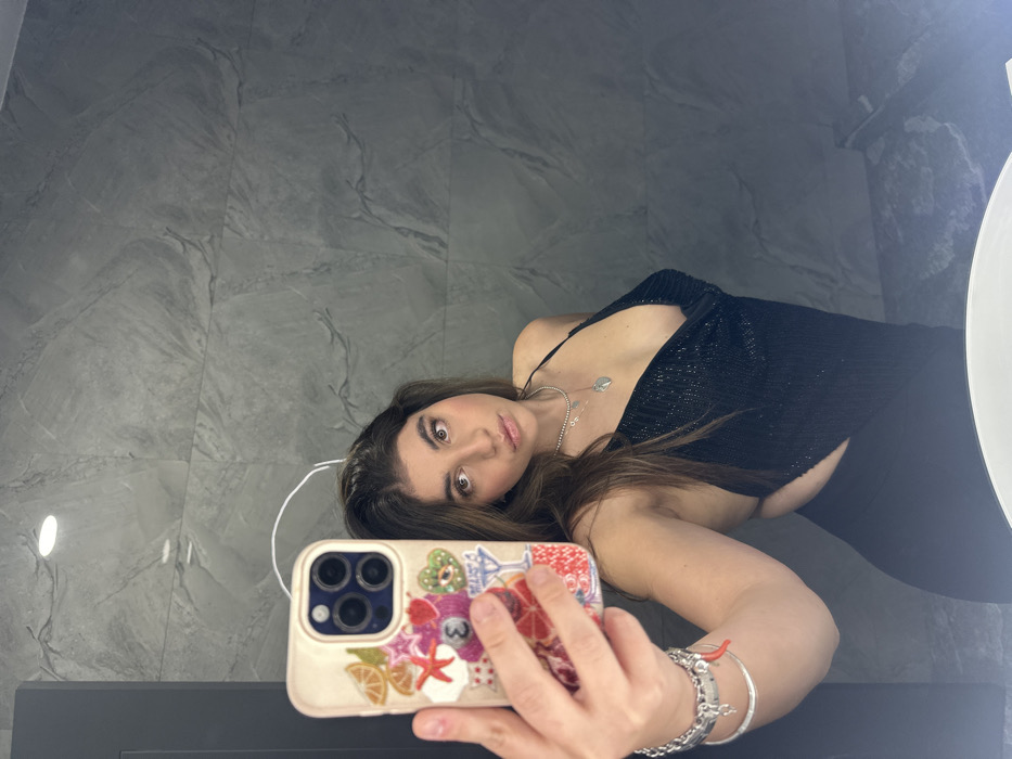 A woman with long brown hair and brown eyes takes a mirror selfie. She's wearing a black low-cut sequin top and a silver necklace. Her phone has a decorated case. Several silver bracelets adorn her wrist. Gray-tiled walls are visible in the background. Part of a white sink or toilet bowl is seen on the right.