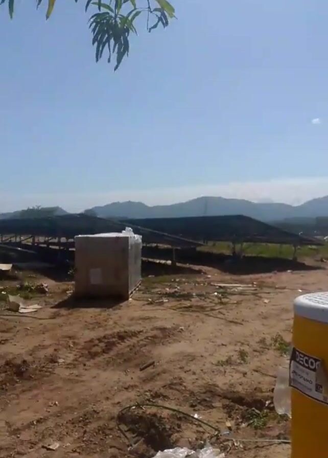 solar panel installation site. The camera pans across the scene, revealing rows of solar panels on metal frames, mounted on concrete supports. Several boxes, likely containing more solar panels or equipment, are scattered around the dirt ground. In the background, there are mountains under a blue sky with scattered clouds. There is also a yellow container with the label "DECCOTANQUE" visible.