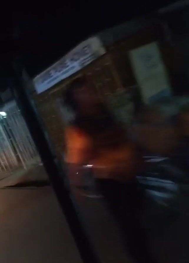 The video appears to be shot from inside a vehicle, possibly a tuk-tuk or auto-rickshaw, driving at night. The environment is a street with buildings on either side, some illuminated by lights. People are seen walking and standing near the buildings. There are also motorcycles parked along the street. The video is shaky, indicating movement, and the quality is low due to the darkness.