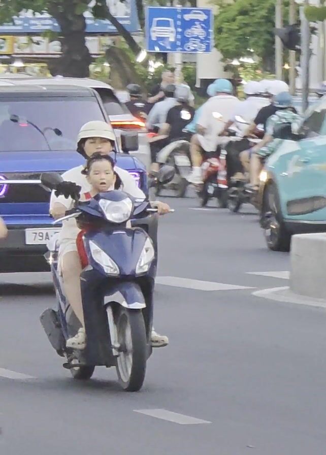 n urban street scene in Vietnam. A blue electric car, with license plate "79A-572.70," drives past. The distinctive headlights glow purple. The camera follows motorcycles traveling on the street. Many of the riders wear helmets and face masks. There is greenery and buildings in the background, and a large advertisement is visible in the distance.