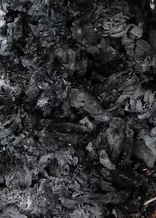 pile of gray and black ash, with glowing red embers visible in some areas