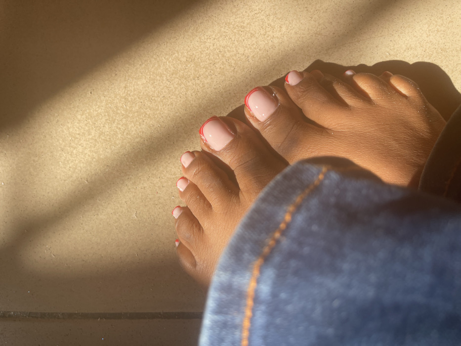 A close-up, downward-angle image taken in Kubwa, Nigeria, depicts a pair of human feet with dark skin, resting on a light brown, granular-textured ground surface, possibly tiles. The toenails are pedicured with a translucent light-pink or nude base coat, each featuring a distinct thin red line along the tip. A segment of blue denim fabric with visible orange-brown stitching, consistent with jeans, occupies the lower-left portion of the frame, partially obscuring the left ankle area. Strong, directional natural sunlight illuminates the scene, casting multiple parallel diagonal shadows across the floor and partially over the feet and fabric.