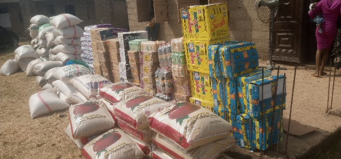 The image depicts an outdoor scene in Kafanchan A, Nigeria, featuring a substantial quantity of packaged goods systematically stacked on light brown, sandy ground adjacent to a building