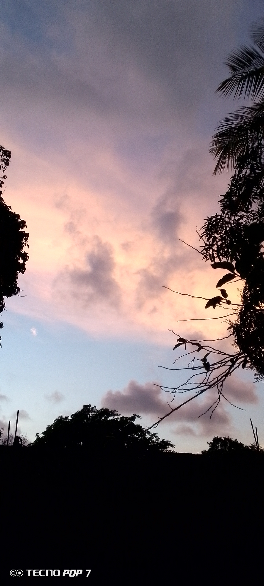The image depicts a sunset sky in Altagracia, Venezuela. The sky is filled with pink and grey clouds, and a small patch of blue sky is visible near the horizon. The silhouettes of trees are visible in the foreground, framing the sky. The bottom of the image is dark, revealing the 'TECNO POP 7' watermark. A single coconut tree can be seen on the right.