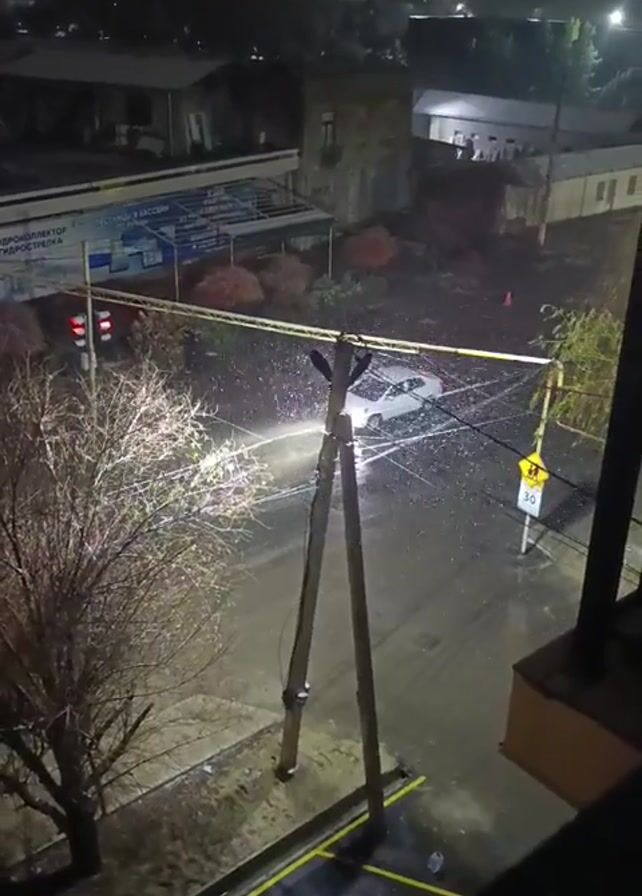 From an elevated angle, the video depicts a street scene at night during heavy snowfall. A white car sits stationary in the middle of the intersection, its headlights illuminating the falling snow. A bare tree stands on the left, and a wooden utility pole dominates the foreground. Streetlights cast a stark glow on the wet, snow-covered road. A building and the blurred outlines of other buildings are visible in the background, along with a traffic light showing a red signal. There is also a speed limit sign indicating 30, presumably kilometers per hour. The environment suggests urban or suburban surroundings.