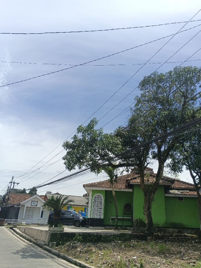 The image depicts a neighborhood scene under a partly cloudy sky. Several houses are visible, ranging in color from white to bright green, with a single dark-colored car parked nearby. Wires crisscross overhead, intersecting with trees that partially obscure some structures. The foreground contains a road and a grassy area.
