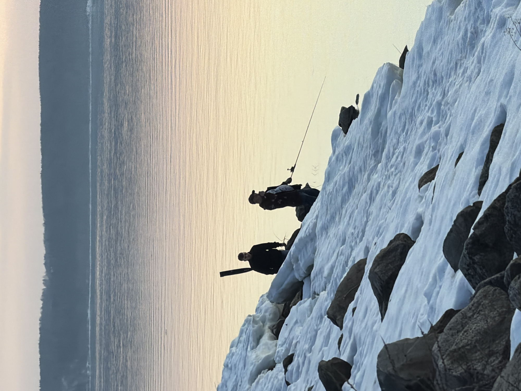 Two people stand on a snow-covered, rocky embankment along a body of water in Chaikovsky, Russia. One person is fishing with a rod, while the other holds a long, dark object. The background shows a shoreline across the water, under a pale sky.