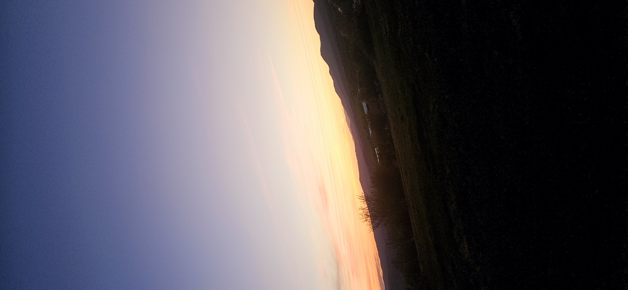 landscape at sunset in Momin Prohod, Bulgaria. The sky transitions from deep blue to orange and yellow, suggesting the sun is setting. The right side of the image is dominated by a dark, shadowy area. A line of hills or a mountain range is silhouetted against the bright sky. There appear to be some structures or buildings faintly visible along the horizon line in the lighted area, as well as a small bush in the bottom center. The landscape is partially visible in the area that is not in shadow.
