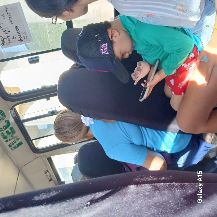 Inside a vehicle, a child wearing a green shirt and "Captain America" cap holds a smartphone. The child sits near a woman in a striped top and a bare leg. Another woman in a blue shirt sits in front of them. The window shows an outdoor view. A sign with handwritten text is visible on the window. The vehicle's interior is visible, with a seat in the foreground. The image includes a "Galaxy A15" watermark.