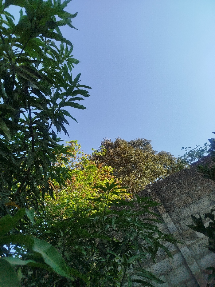 A vibrant upward shot captures a clear blue sky framed by lush greenery. Dense foliage, featuring mango trees, fills the foreground and left side. Sunlight filters through leaves, creating bright highlights. A weathered gray wall borders the right side, with more trees behind it. The perspective creates a sense of height and immersion in nature.
