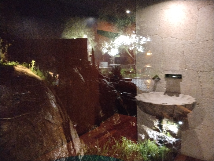 A stone fountain against a stone wall, illuminated with upward-facing lights, stands in the right foreground. Through a glass panel, a partially obscured outdoor setting unfolds. A dark, possibly wet, rock structure dominates the left side, flanked by greenery. In the distance, a lit tree and building facade create a luminous backdrop. The overall ambiance is dark, reflecting the interplay of water, stone, and light within a nighttime scene.