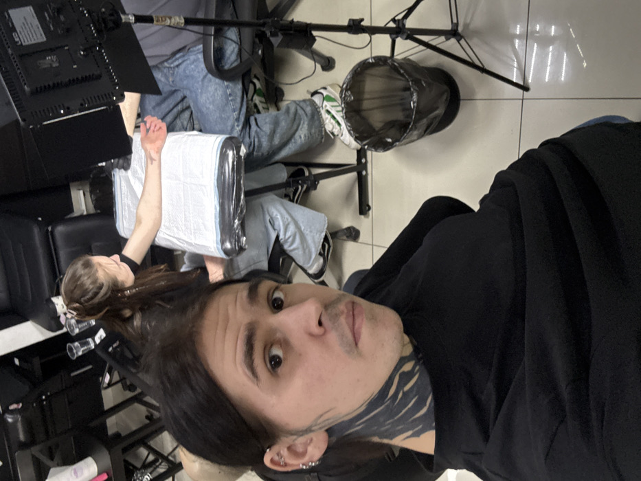The scene depicts an interior view of a tattoo studio in Rostov-on-Don, Russia. In the foreground, a male individual with long dark hair, visible black neck tattoos, and multiple ear piercings on his left ear is taking a selfie, looking directly at the camera. He wears a black long-sleeved shirt. Behind him, a tattoo session is underway. A female tattoo artist with brown hair is seated, actively working on the right forearm of a client. The client, whose lower body is visible, wears light blue denim jeans and white sneakers with green accents. The client's right forearm rests on a black padded armrest, which is covered with a disposable white protective barrier. To the right of the client's arm, a square LED light panel on a tripod stand provides illumination for the session. A black cylindrical trash can with a black liner stands on the white tiled floor near the light stand. Several dark chairs and small tables are present in the background.