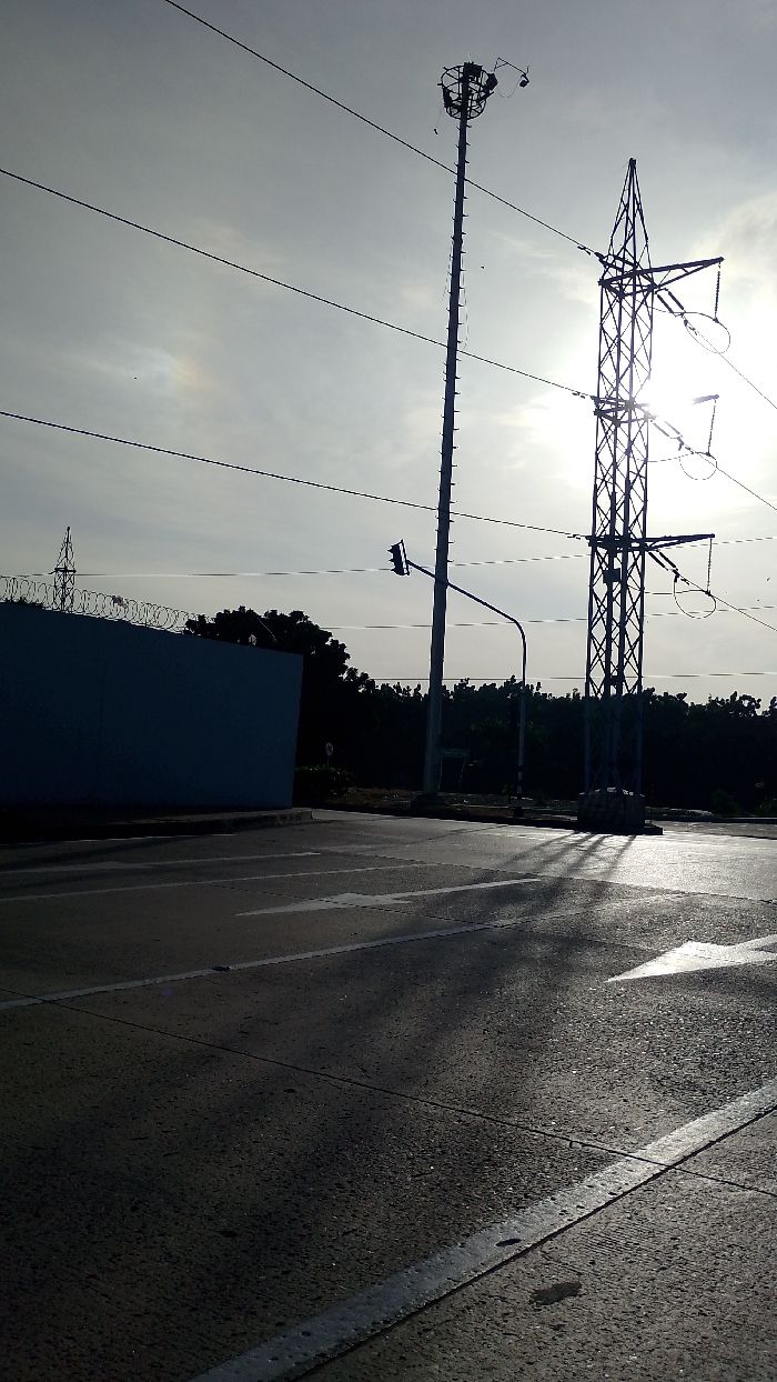 A streetscape featuring infrastructure elements under a bright sky. A tall lighting tower stands to the left, adjacent to a traffic light. To the right, a high-voltage transmission tower is partially obscured by sunlight. A low building with barbed wire on top flanks the left. The street has directional markings. Dense trees line the background. The sun creates long shadows on the pavement, adding contrast to the scene.