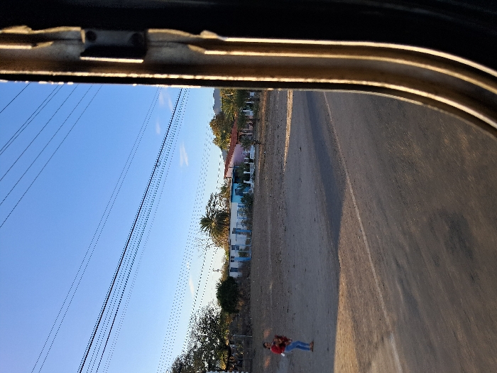 A roadside view is framed by a window. The sky is blue with power lines in the foreground. Buildings line the road. There is a person on the right side of the road with red shirt and blue jeans. The road is sandy and brown. The frame of the window is visible at the top and side.