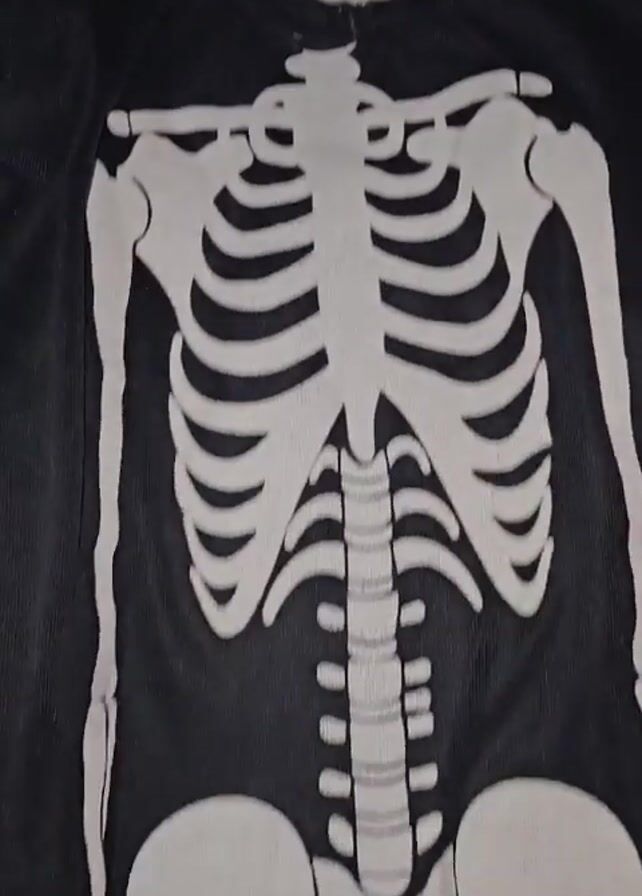 Halloween costume that appears to be laid out on a flat surface. The costume features a white plastic mask with red spiral markings on the cheeks and red lips, resembling the "Jigsaw" character from the "Saw" movie franchise. Attached to the mask is a black fabric garment with a white skeleton print on the front, depicting the ribcage, pelvis, legs, and arms. The background is slightly out of focus but seems to be a patterned surface, possibly a bedspread or tablecloth.