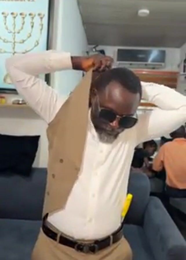 A man with a gray beard and sunglasses puts on a tan vest over a white, long-sleeved button-down shirt and tan pants. The vest is double-breasted with several buttons, but the man doesn't fasten them. He looks down and adjusts the vest. A yellow and red pen are visible in his pocket. A framed image hangs on the wall with the text "EXODUS 25:31-40 ZECHARIAH 4:2" and a depiction of a menorah. A blue couch is visible behind the man, and another person sits on the couch further away. An air conditioner is visible on the ceiling.