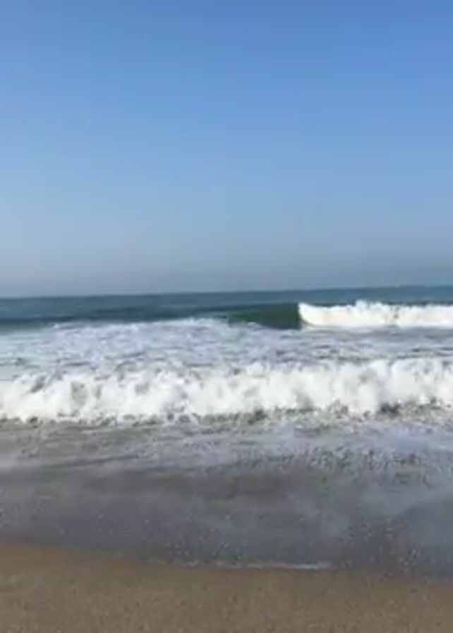 The video displays a beach on a sunny day. The camera pans from a close-up of waves washing onto the sand to a wider view of the beach. The sand appears to be a light brown color. The waves are moderate, with white foam. The water is a shade of blue-green. In the background, there is a large, dark, rocky hill or mountain partially obscured by haze. The sky is clear and blue. There is no visible human presence.