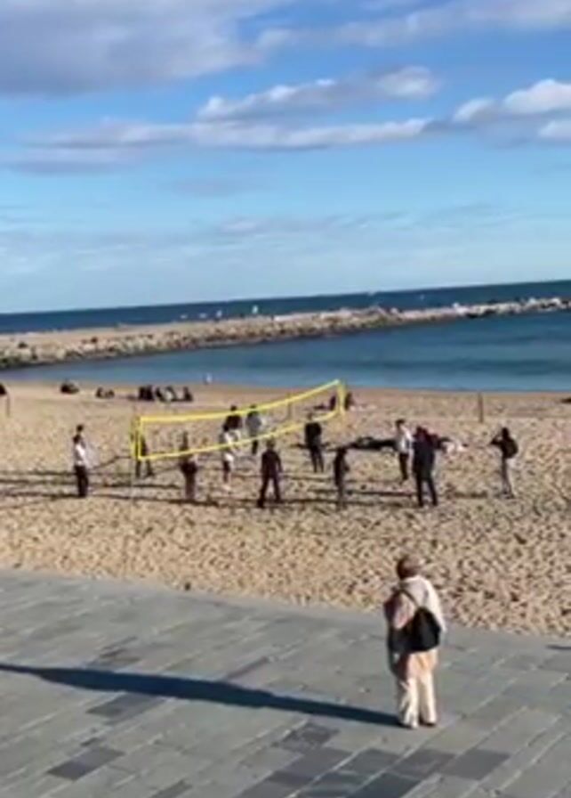 beach volleyball game taking place on a sunny day. A group of people are playing volleyball on a sandy beach with a yellow net set up in the middle. In the background, there is a body of water with a breakwater or jetty stretching out into it. Several people are sitting and relaxing on the breakwater. The sky is blue with some scattered white clouds. In the foreground, there is a paved area where a few people are walking by, including one person standing and observing the volleyball game. The overall scene appears to be a relaxed and pleasant beach setting.