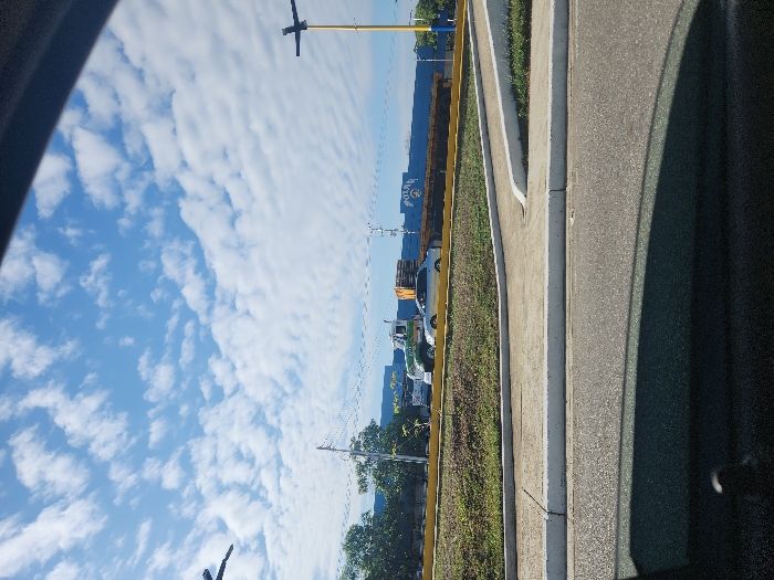 The image depicts an exterior scene in Tinaquillo, Venezuela. The foreground shows a segment of dark asphalt roadway, partially obscured by a dark, curved shadow consistent with a vehicle's interior. A concrete curb system separates the road from a paved, upward-sloping walkway and ramp. Elevated beyond this, a grassy embankment features low green foliage and is bordered by a yellow protective barrier. Positioned behind this barrier are a light-colored sedan and, to its left, a green and white commercial truck with a classic cab design. In the background, a large, blue industrial-style building is visible, bearing the distinct white lettering "POLAR" on its facade. Multiple wooden pallets are stacked near the building. Overhead, electrical power lines are strung between utility poles, one of which has a yellow and black top section on the far right. The sky is clear blue, populated by numerous dispersed white stratocumulus clouds, indicating bright daylight.