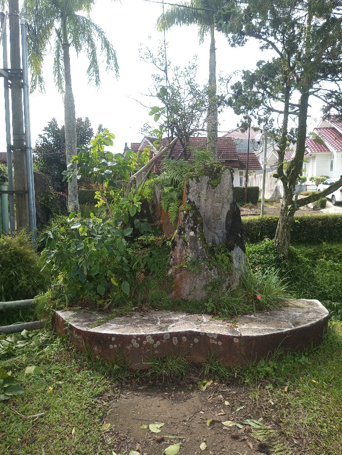 - "A circular stone platform, likely a repurposed base, supports a large, upright rock overgrown with moss, ferns, and other vegetation" by FM-YpPV53, licensed under CC BY 4.0