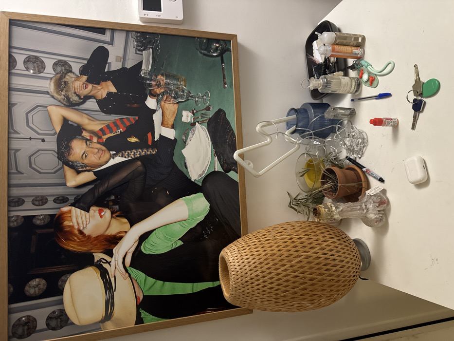 A framed portrait of people in formal attire leans against a white wall. To the right, a collection of items are arranged: a black shelf with small bottles, keys, pens, lip gloss, AirPods, a plant in a terracotta pot, and a decorative glass vase with small lights. A woven lamp base sits in the foreground, partially obscuring the other items.