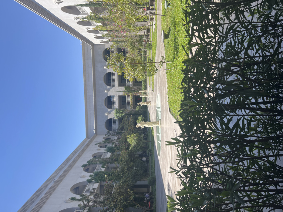 A bright, symmetrical courtyard is flanked by light-colored buildings with arched balconies. Lush greenery covers the ground and some building facades. A pathway stretches through the courtyard, dotted with statues and trees. The sky is clear blue, with a large bush obscuring part of the view.