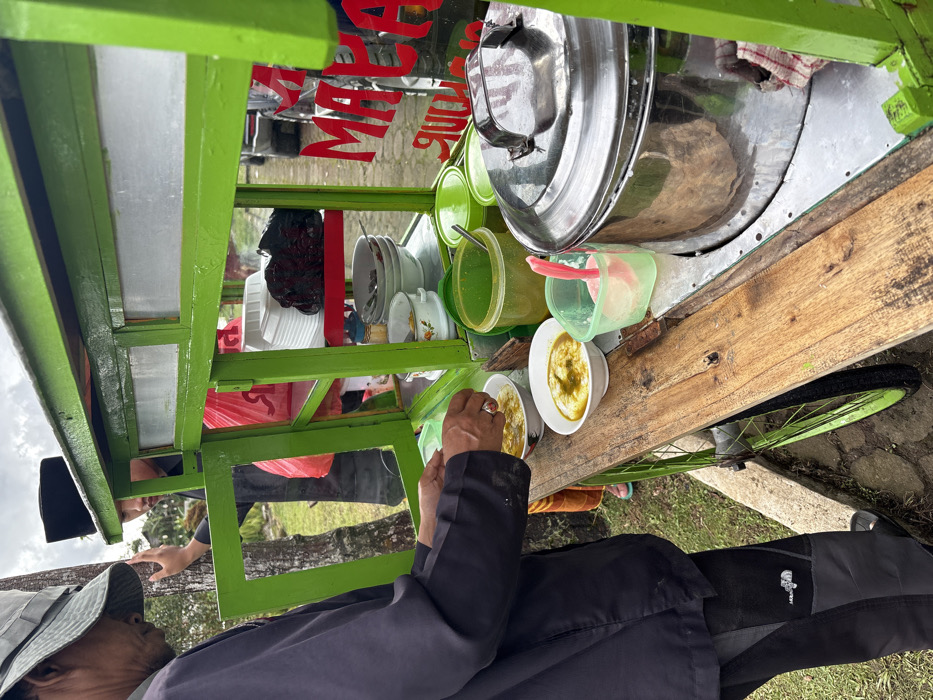 A man in a hat sits next to a green food cart. Bowls of food are on the cart, next to various utensils, containers, and stacked dishes. A large silver pot with a lid is on the top. A wheel of the cart is visible on the right. The red text on the glass is mirrored and unreadable.