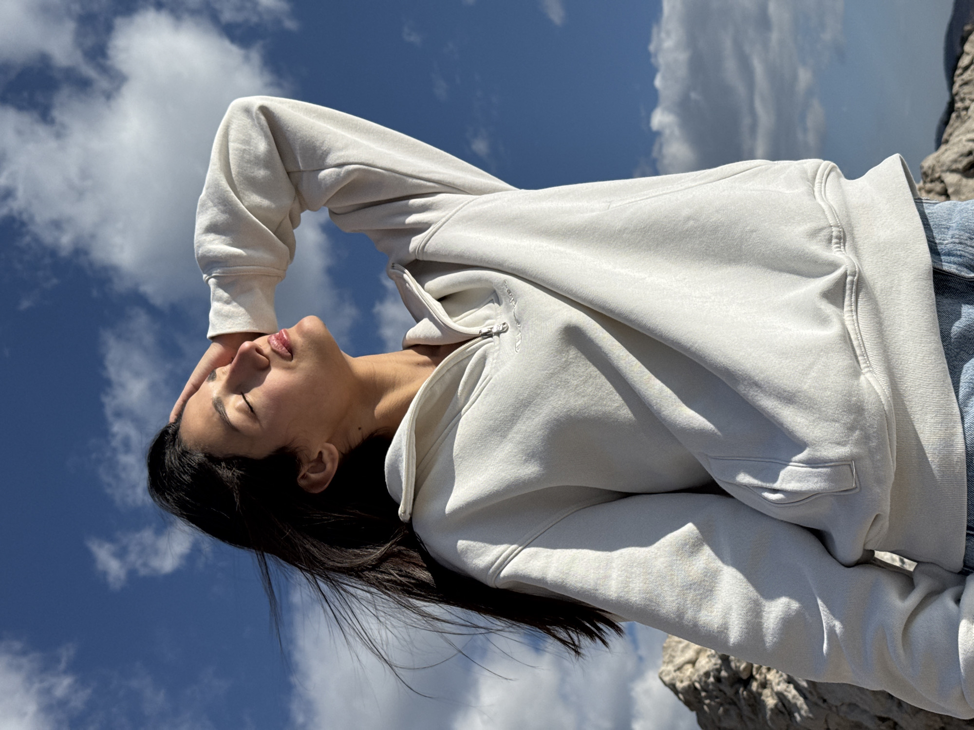 A woman reclines with her right hand on her forehead against a blue sky with fluffy white clouds. She wears a light beige hooded sweatshirt and denim, possibly jeans. Her eyes are closed, and her dark hair flows to the left. The camera angle is low, looking up at her, with part of a rocky surface visible in the lower right corner. Sunlight creates shadows and highlights on her face and clothing.