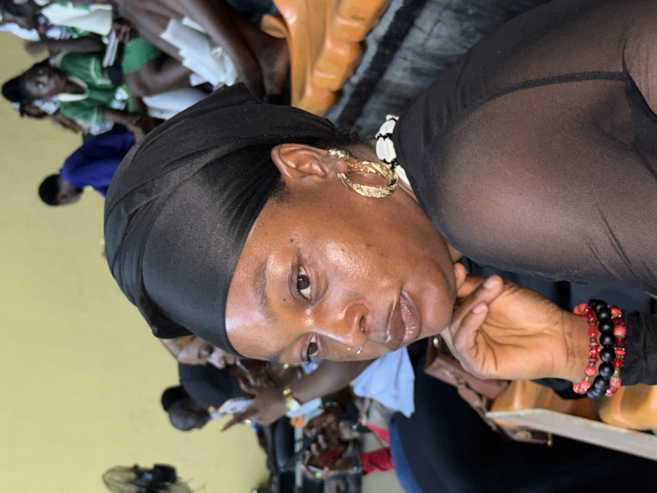 An indoor scene in Iganmu, Nigeria, features a dark-skinned woman in the foreground, seated and looking left with her chin slightly elevated. She wears a black headwrap, a small silver nose ring, and large, textured gold-colored hoop earrings. A black and white beaded necklace is partially visible around her neck. On her left wrist, she wears multiple bracelets composed of black and red beads, some with embedded sparkling elements. Her attire consists of a black sheer long-sleeved top, under which a black garment strap is visible. The background, blurred, shows additional individuals seated in rows of orange stadium-style seating. To the left, a black oscillating fan is mounted on a yellow wall. Other persons in the background are partially visible, including some wearing green and white clothing, and a person in a blue shirt further back. One individual's bare feet are discernible resting on the orange seating. The overall environment appears to be an indoor gathering space with artificial lighting.