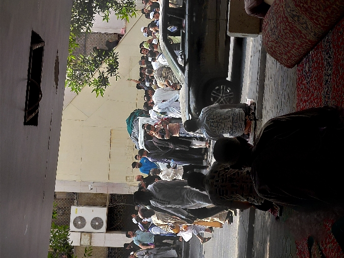 The image depicts an urban street scene in Makkah Al Mukarramah, Saudi Arabia, viewed from beneath an elevated concrete structure. In the immediate foreground, three adult males are seated on patterned red and black rugs on a paved surface, with their backs to the observer. The man closest to the camera is silhouetted; the man in front of him wears a light-colored, patterned shirt and is seated on a small orange mat. On the street level beyond these individuals, a black sedan is positioned, its front facing left. A dense crowd of approximately 40-50 individuals, predominantly adult males, occupies the street and sidewalk area behind and to the left of the sedan. Many in the crowd wear traditional garments such as thobes and head coverings, while others are in casual attire. A white utility vehicle, partially obscured by the crowd and loaded with items covered by a green tarp, is visible further back within the gathering. On the far left, additional pedestrians are moving along the street, including a child in light clothing. In the background, a light-colored building with multiple facade elements is visible. Two white outdoor air conditioning units with circular grilles are mounted on its exterior wall, below which a security camera is affixed. Green foliage from trees is present on both sides of the frame, extending into the background. Overhead, the concrete structure features two rectangular openings, one exposing internal wiring. The scene is illuminated by daylight, casting shadows consistent with a sunny environment.