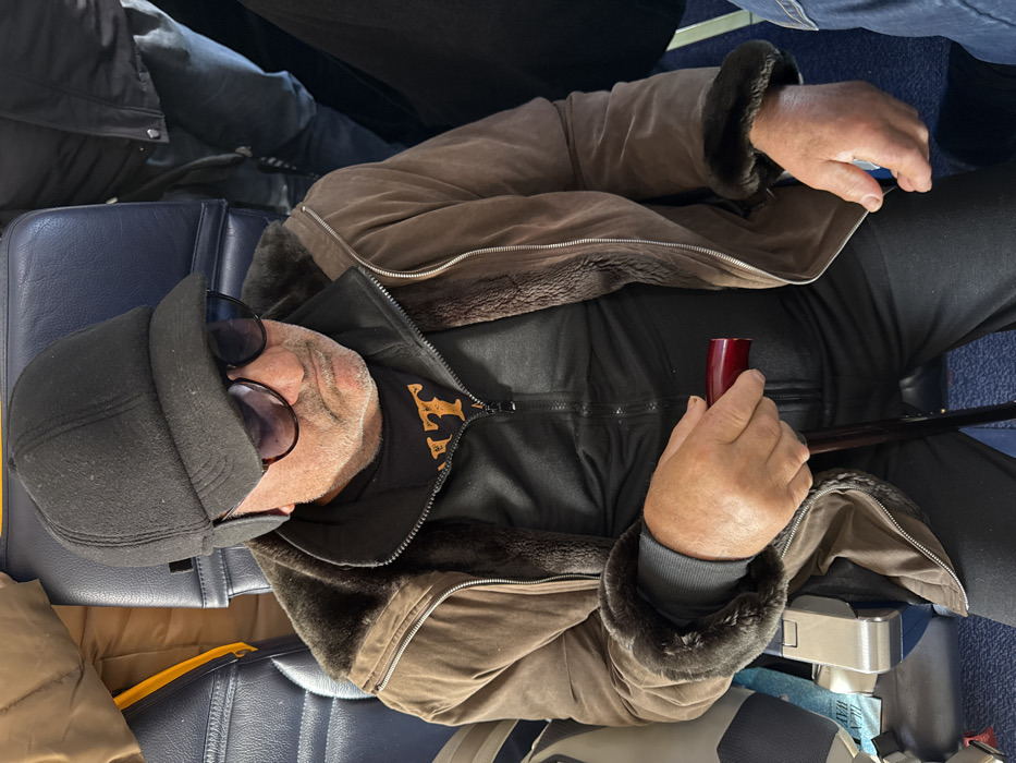 An adult male is depicted seated within an indoor transport environment, likely an aircraft or bus cabin. The location cannot be confirmed as Moreira, Portugal, based on visual evidence. The man, appearing middle-aged to older, wears a black baseball cap with ear flaps and dark-tinted sunglasses with dark frames. He has short facial stubble. His attire consists of a brown suede-like jacket featuring dark fur lining or trim on the collar, cuffs, and interior, worn over a black long-sleeved zipped jacket, and a dark t-shirt with a partially visible orange graphic. He is wearing dark trousers. His right hand holds a dark, possibly wooden, walking cane with a reddish-brown handle, while his left hand rests near his lap. He is seated in a blue upholstered seat with a metallic armrest visible to his left. Other passengers are partially visible, with a brown jacket in the seat immediately in front and a person in blue jeans and dark attire to his right. The man's expression is neutral, with his head slightly downcast.